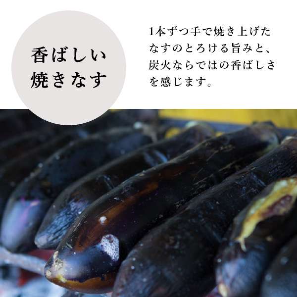 炭火の香ばしさが口いっぱいに広がる、とろける食感の焼きなすが自慢です。