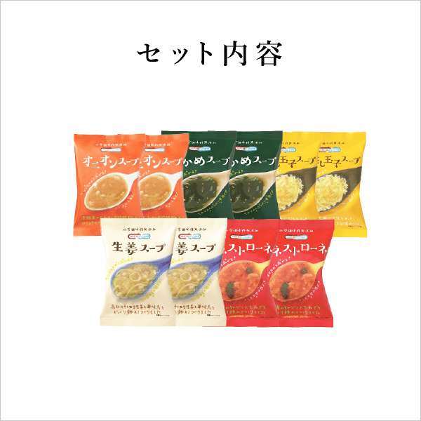 | 内容 | オニオンスープ×2、わかめスープ×2、和だし玉子スープ×2、生姜スープ×2、ミネストローネ×2 |