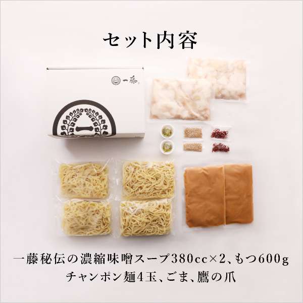 | 内容 | 一藤秘伝の濃縮味噌スープ 380cc×2、もつ600g、チャンポン麺 4玉、その他(ごま、鷹の爪、作り方説明書) ※野菜はセット内容に入っておりませんので、キャベツ、ニラ、ゴボウなどお好みでご準備ください。 |