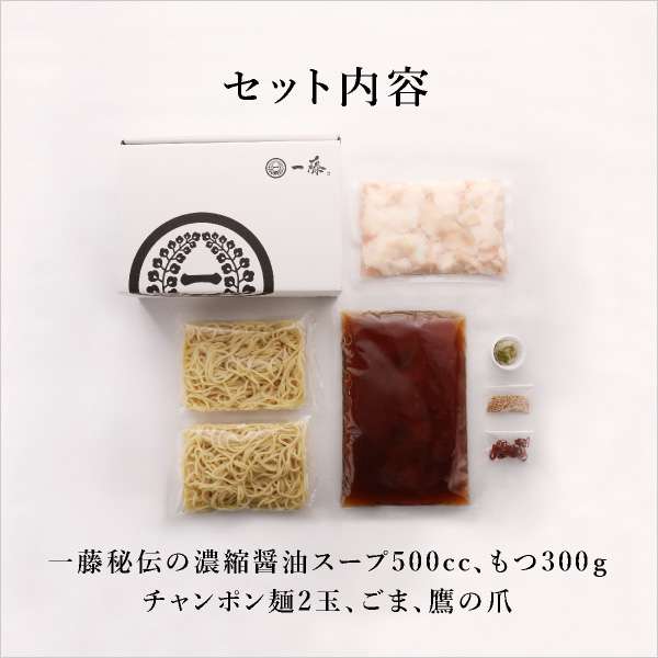 | 内容 | 一藤秘伝の濃縮醤油スープ 500cc×2、もつ600g、チャンポン麺 4玉、その他(ごま、鷹の爪、作り方説明書) ※野菜はセット内容に入っておりませんので、キャベツ、ニラ、ゴボウなどお好みでご準備ください。 |