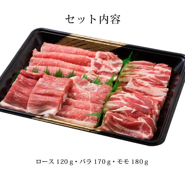 | 内容 | 豚ロース焼肉用(120g)、豚バラ焼肉用(170g)、豚モモ焼肉用(180g) |