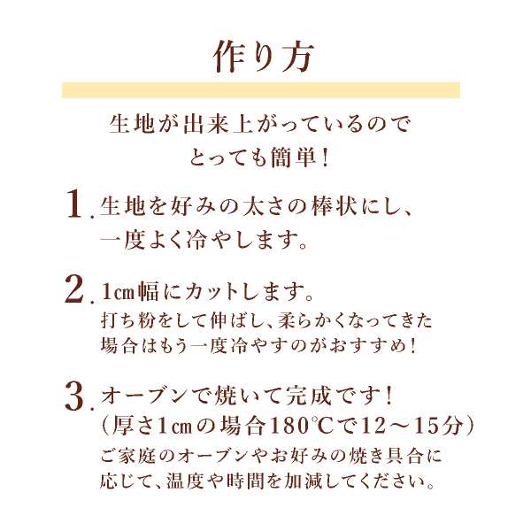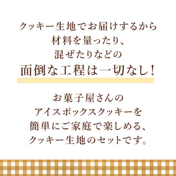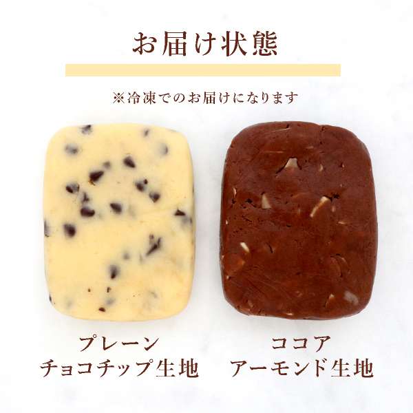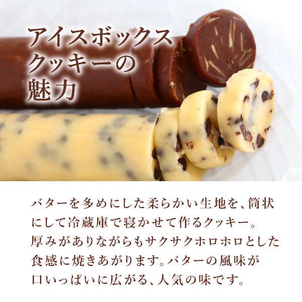 | 内容 | アイスボックスクッキー生地(チョコチッププレーン200g、アーモンドココア200g) ※クッキーの作り方説明書付き |