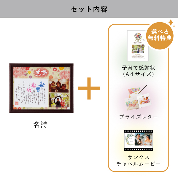 | 無料特典 | ブライズレター1セット(レターケース、専用レター5枚)、子育て感謝状(A4サイズ)(※フレームは付きません。)、サンクスチャペルムービーの中から1つお選びいただけます。 |