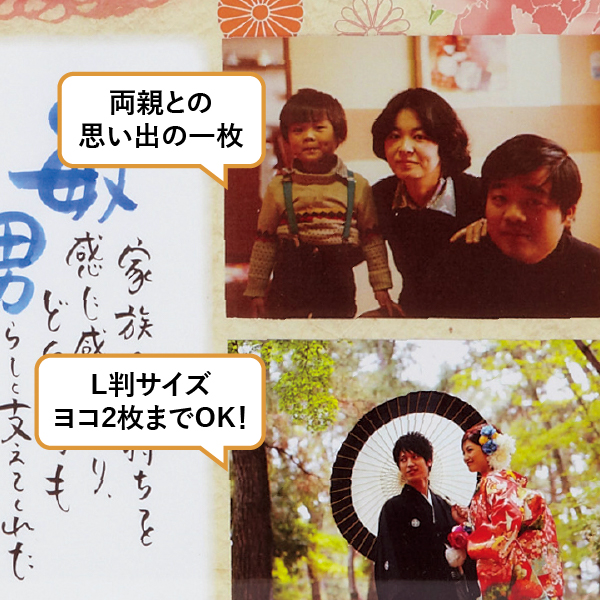 2枚写真を入れることができるので、前撮りの写真や、幼い日の家族写真を入れるも良しです。