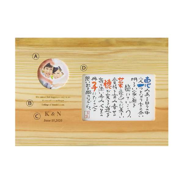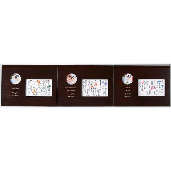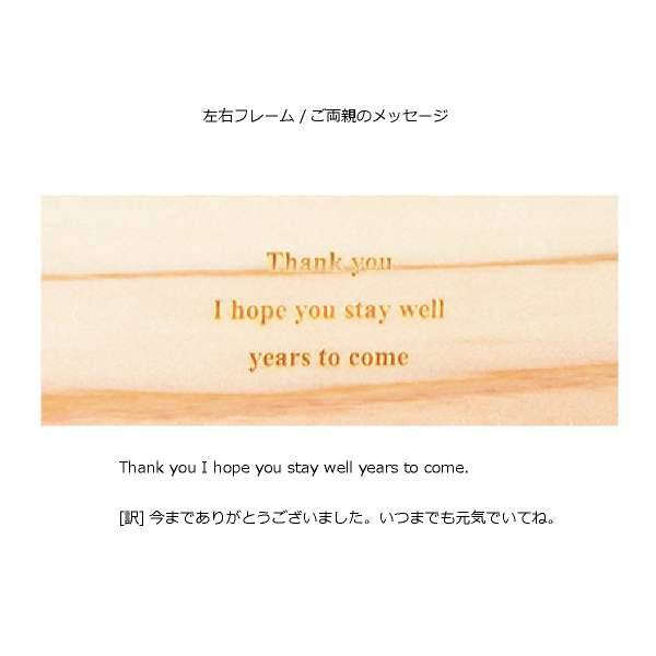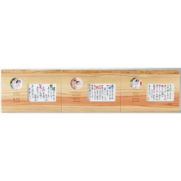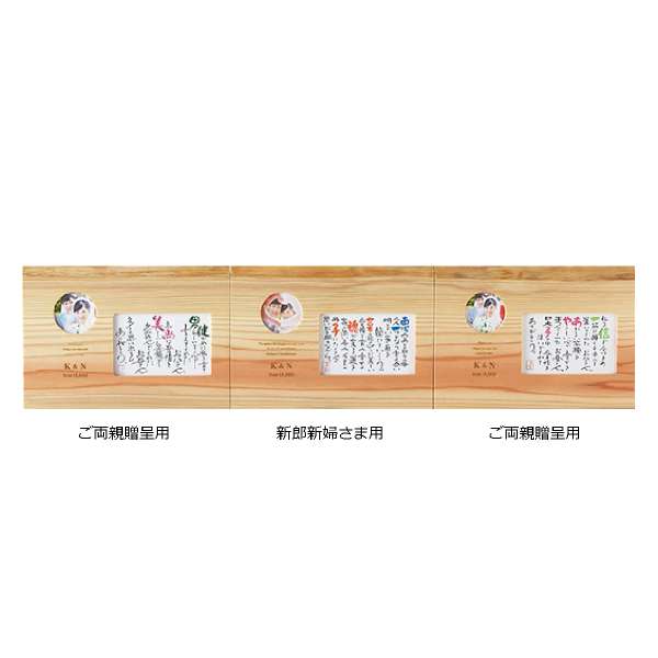 一枚板を三分割して作り出されたフレームには、それぞれの名前を織り込んだポエムと写真を添えることができ、両親のみならず、ふたりの手元にも1つあることで、絆を感じられるギフトです。