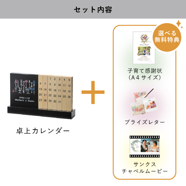 | 無料特典 | ブライズレター1セット(レターケース、専用レター5枚)、子育て感謝状(A4サイズ)(※フレームは付きません。)、サンクスチャペルムービーの中から1つお選びいただけます。 |