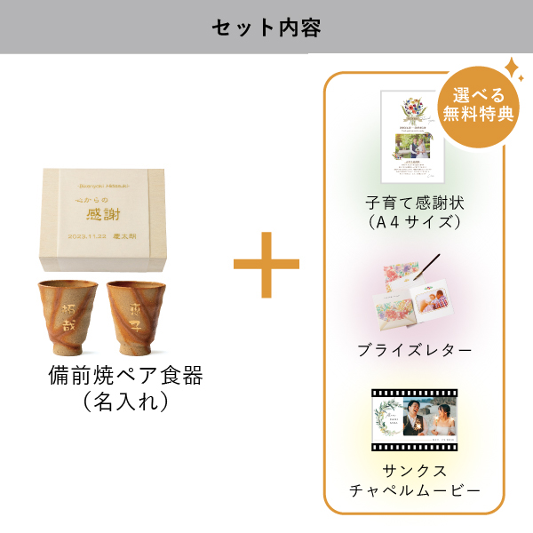 | 無料特典 | ブライズレター1セット(レターケース、専用レター5枚)、子育て感謝状(A4サイズ)(※フレームは付きません。)、サンクスチャペルムービーの中から1つお選びいただけます。 |