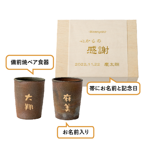 | 備考 | ※カップにお名前が入ります。 ※木箱の帯に贈る方のお名前と記念日が入ります。 ※焼き物の為、全て風合いは異なります。 |
