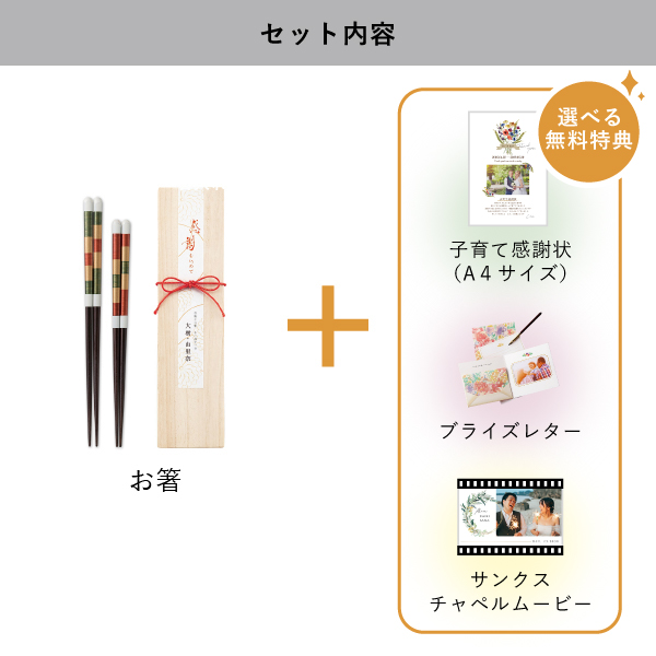 | 無料特典 | ブライズレター1セット(レターケース、専用レター5枚)、子育て感謝状(A4サイズ)(※フレームは付きません。)、サンクスチャペルムービーの中から1つお選びいただけます。 |