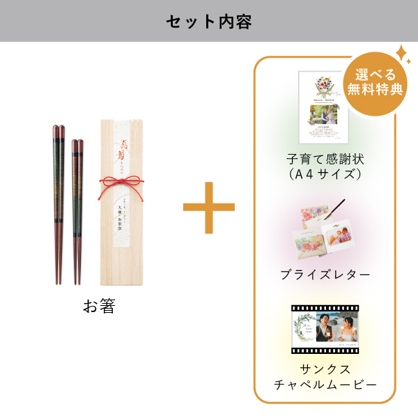 | 無料特典 | ブライズレター1セット(レターケース、専用レター5枚)、子育て感謝状(A4サイズ)(※フレームは付きません。)、サンクスチャペルムービーの中から1つお選びいただけます。 |