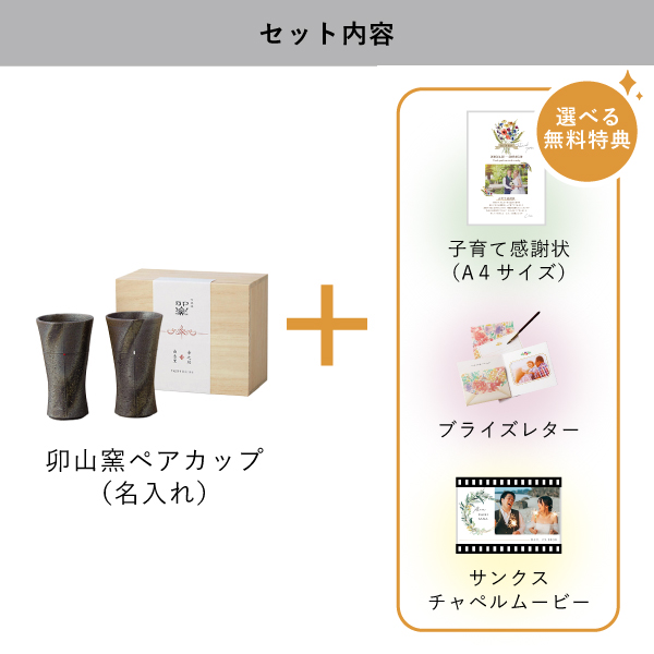 | 無料特典 | ブライズレター1セット(レターケース、専用レター5枚)、子育て感謝状(A4サイズ)(※フレームは付きません。)、サンクスチャペルムービーの中から1つお選びいただけます。 |