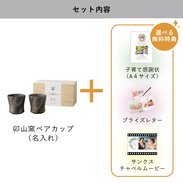 | 無料特典 | ブライズレター1セット(レターケース、専用レター5枚)、子育て感謝状(A4サイズ)(※フレームは付きません。)、サンクスチャペルムービーの中から1つお選びいただけます。 |