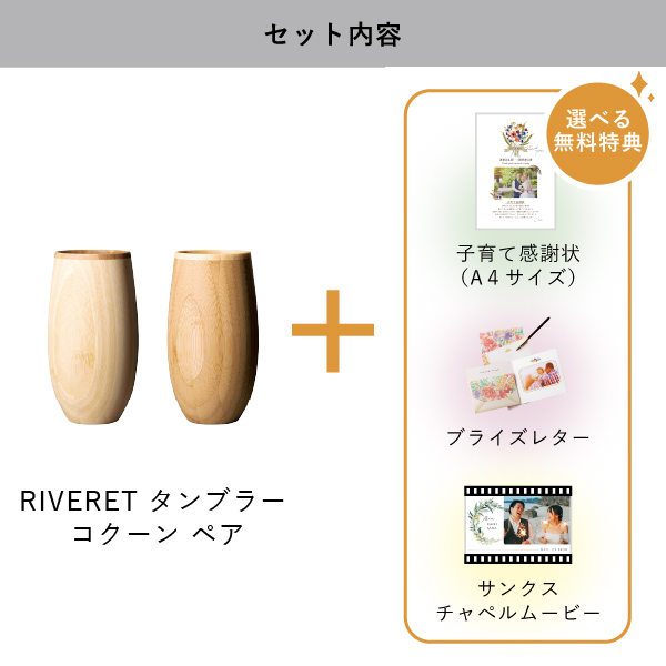| 無料特典 | ブライズレター1セット(レターケース、専用レター5枚)、子育て感謝状(A4サイズ)(※フレームは付きません。)、サンクスチャペルムービーの中から1つお選びいただけます。 |