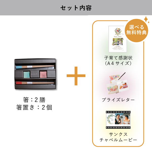 | 無料特典 | ブライズレター1セット(レターケース、専用レター5枚)、子育て感謝状(A4サイズ)(※フレームは付きません。)、サンクスチャペルムービーの中から1つお選びいただけます。 |