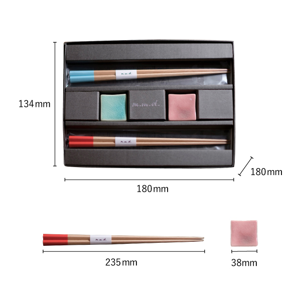 | 内容物 | 箸 + 箸置きセット 箸:「朱」×1「青磁」×1 箸置き:「グレーピンク」×1「青磁」×1 商品サイズ/箸:長さ235mm |
