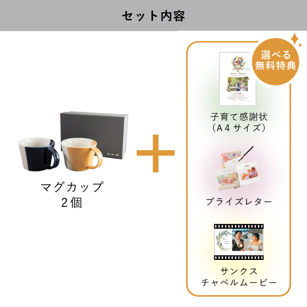 | 無料特典 | ブライズレター1セット(レターケース、専用レター5枚)、子育て感謝状(A4サイズ)(※フレームは付きません。)、サンクスチャペルムービーの中から1つお選びいただけます。 |