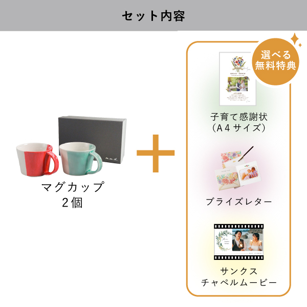 | 無料特典 | ブライズレター1セット(レターケース、専用レター5枚)、子育て感謝状(A4サイズ)(※フレームは付きません。)、サンクスチャペルムービーの中から1つお選びいただけます。 |