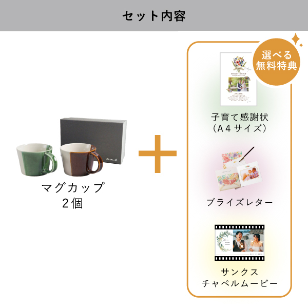| 無料特典 | ブライズレター1セット(レターケース、専用レター5枚)、子育て感謝状(A4サイズ)(※フレームは付きません。)、サンクスチャペルムービーの中から1つお選びいただけます。 |