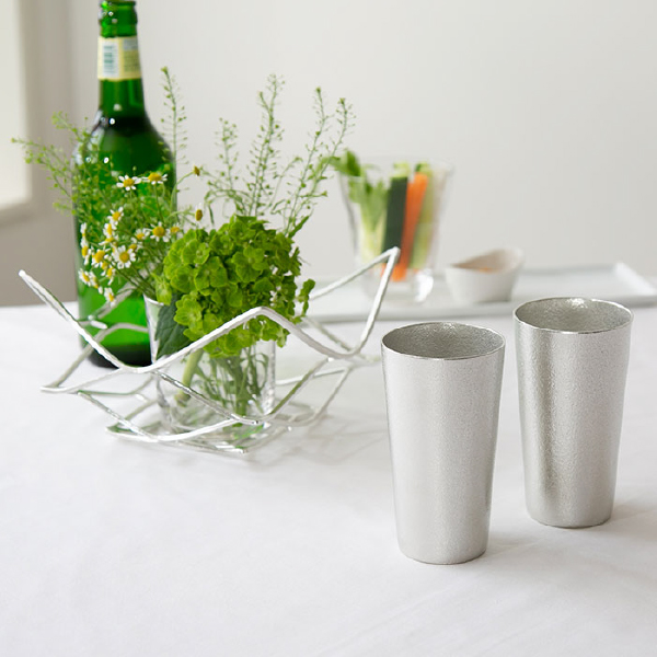 ビールのクリーミーな泡立ちが楽しめる、ビアカップと柔らかい錫の特性を生かした、自由に形を変えられる「KAGOシリーズ」のスクエア(Mサイズ)をセットにしました。