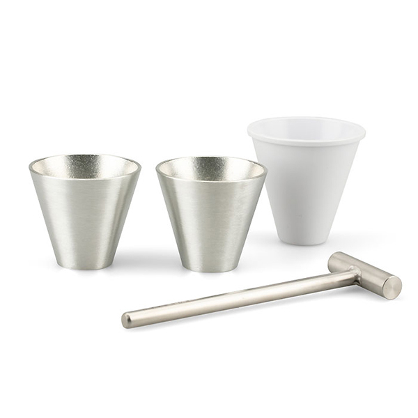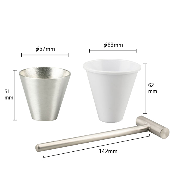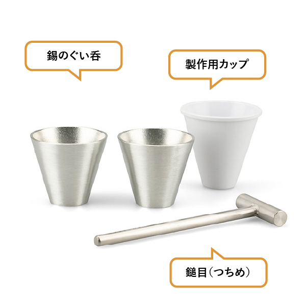 錫製タンブラーの内側にプラスチック製の製作用カップをセットし、ぐい呑みの底面を中心から外に向かって側面を底から飲み口に向かって叩いていくことで、オリジナル模様のぐい呑みを作ることができます。100%の錫はやわらかく、力を入れずに鎚目付けができるため、性別・年齢を問わずにお楽しみいただけます。