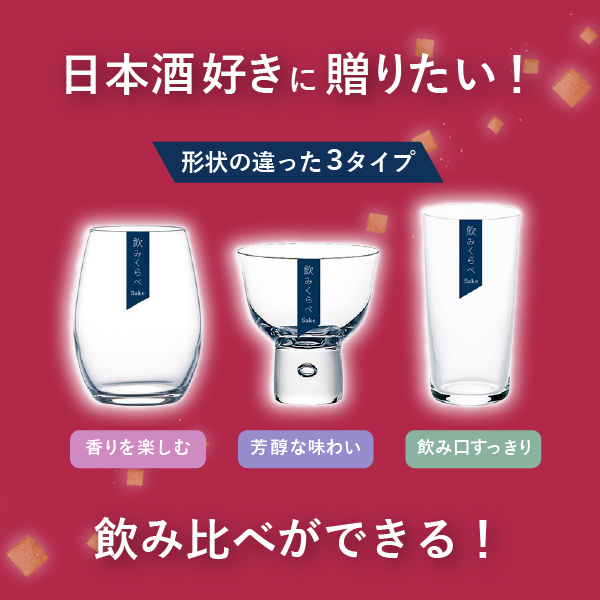形状の違った3タイプ(飲み口すっきり、香りを楽しむ、芳醇な味わい)で日本酒の飲み比べができるセットです。