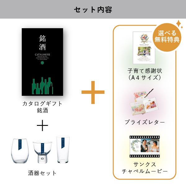 | 無料特典 | ブライズレター1セット(レターケース、専用レター5枚)、子育て感謝状(A4サイズ)(※フレームは付きません。)、サンクスチャペルムービーの中から1つお選びいただけます。 |