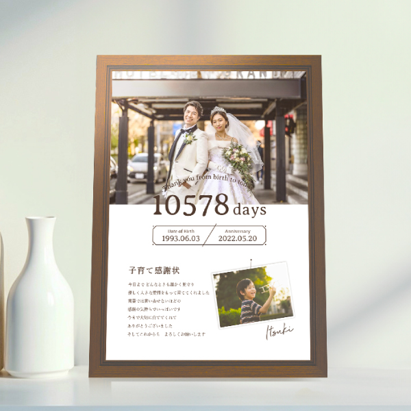 結婚と同時に「子育て」を「卒業する」両親への感謝をつづる子育て感謝状。生まれた日から今日までの日付を記し、今までの感謝をこめて贈ります。(※フレームは付きません。)