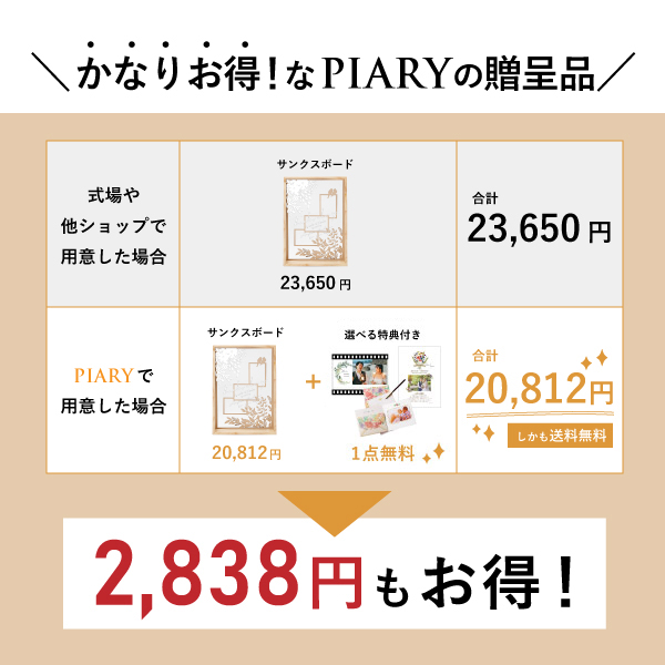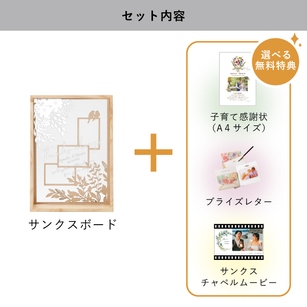 | 無料特典 | ブライズレター1セット(レターケース、専用レター5枚)、子育て感謝状(A4サイズ)(※フレームは付きません。)、サンクスチャペルムービーの中から1つお選びいただけます。 |