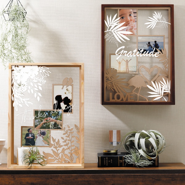 円玄関やリビングに飾れるインテリアとしても素敵で、おしゃれなフォトボードは両親プレゼントとしてピッタリ。
