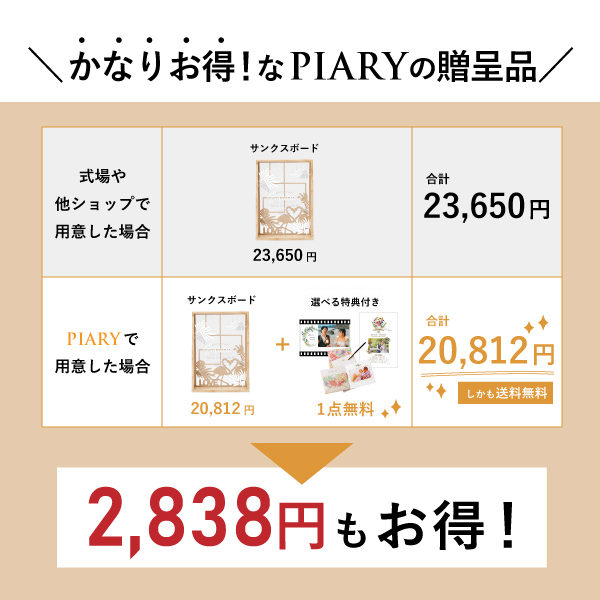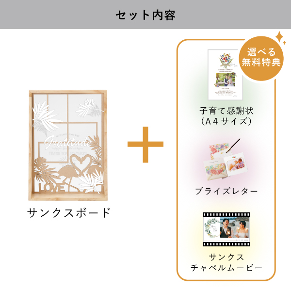 | 無料特典 | ブライズレター1セット(レターケース、専用レター5枚)、子育て感謝状(A4サイズ)(※フレームは付きません。)、サンクスチャペルムービーの中から1つお選びいただけます。 |