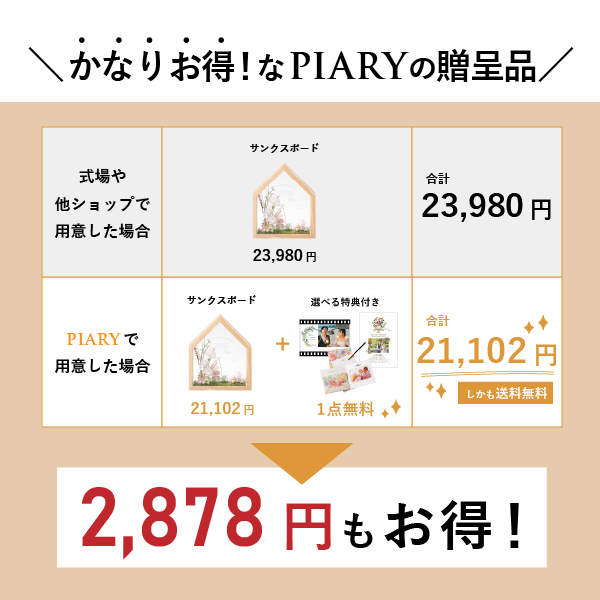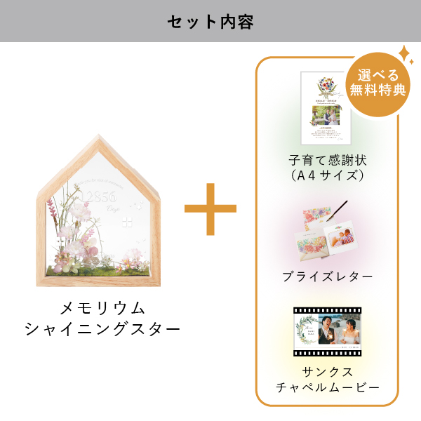 | 無料特典 | ブライズレター1セット(レターケース、専用レター5枚)、子育て感謝状(A4サイズ)(※フレームは付きません。)、サンクスチャペルムービーの中から1つお選びいただけます。 |