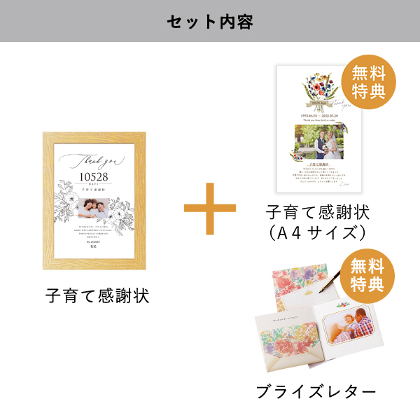 | 無料特典 | ブライズレター1セット(レターケース、専用レター5枚)、子育て感謝状(A4サイズ)(※フレームは付きません。)、サンクスチャペルムービーの中から1つお選びいただけます。 |