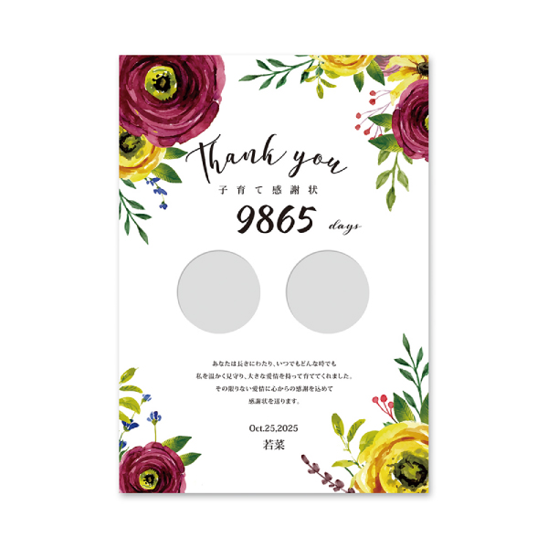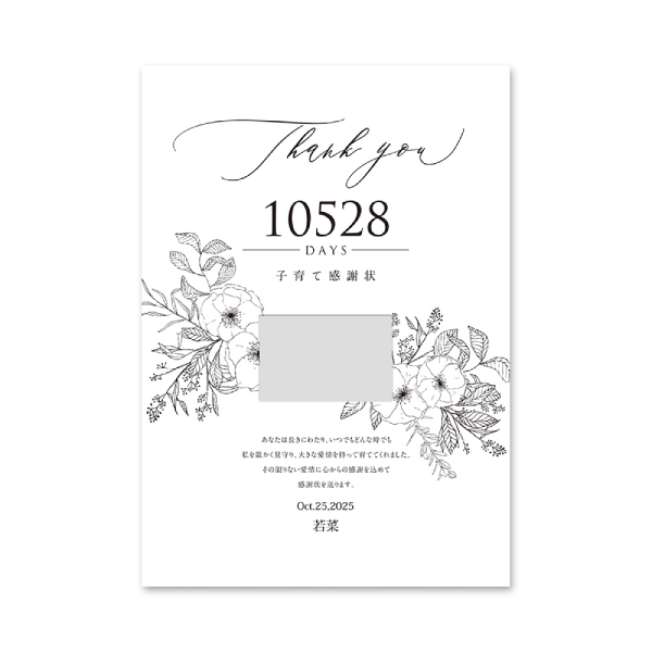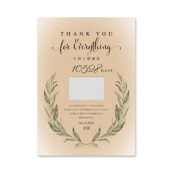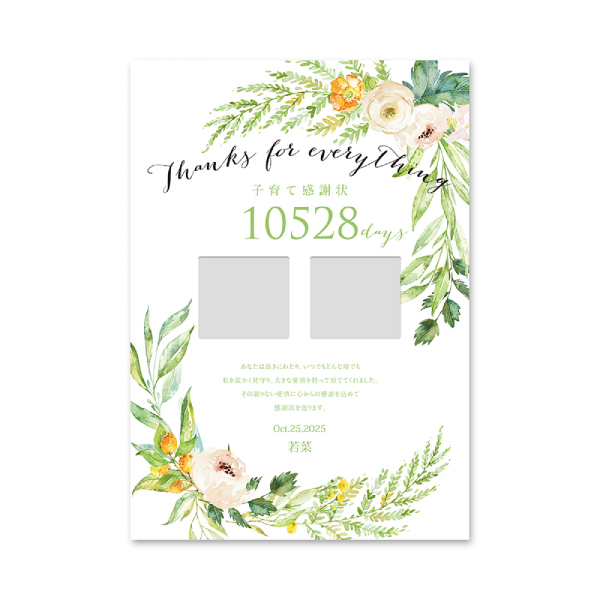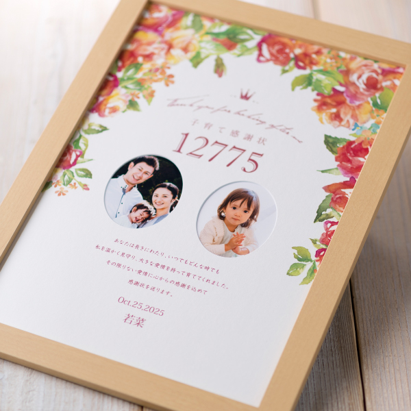 生まれた日から挙式日までの日数を記してたくさんの感謝の想いを込めた子育て感謝状です。