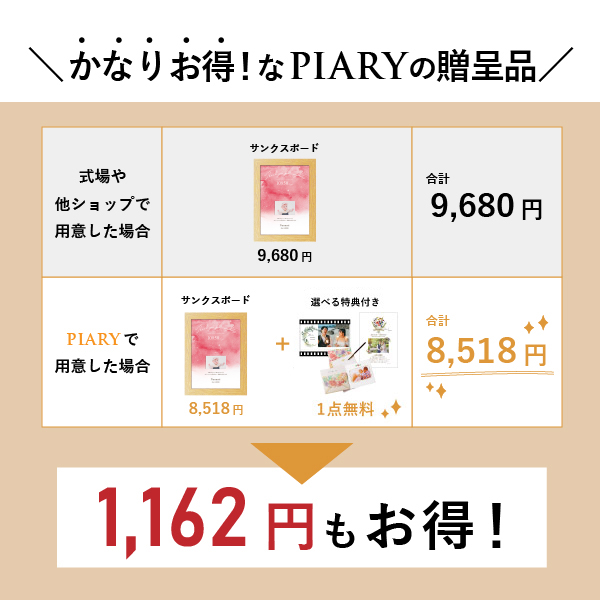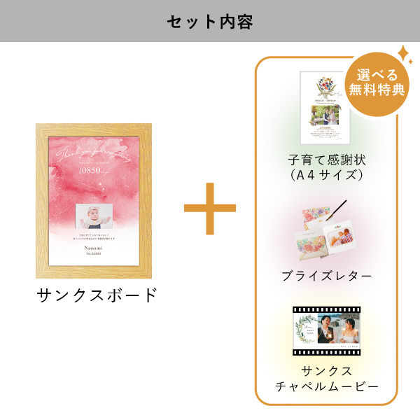 | 無料特典 | ブライズレター1セット(レターケース、専用レター5枚)、子育て感謝状(A4サイズ)(※フレームは付きません。)、サンクスチャペルムービーの中から1つお選びいただけます。 |