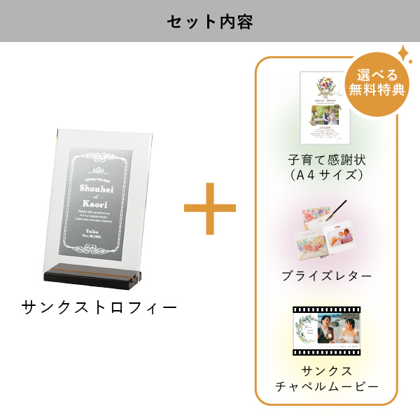 | 無料特典 | ブライズレター1セット(レターケース、専用レター5枚)、子育て感謝状(A4サイズ)(※フレームは付きません。)、サンクスチャペルムービーの中から1つお選びいただけます。 |