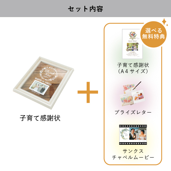 | 無料特典 | ブライズレター1セット(レターケース、専用レター5枚)、子育て感謝状(A4サイズ)(※フレームは付きません。)、サンクスチャペルムービーの中から1つお選びいただけます。 |