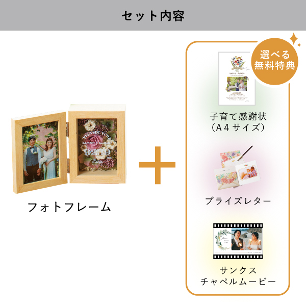 | 無料特典 | ブライズレター1セット(レターケース、専用レター5枚)、子育て感謝状(A4サイズ)(※フレームは付きません。)、サンクスチャペルムービーの中から1つお選びいただけます。 |