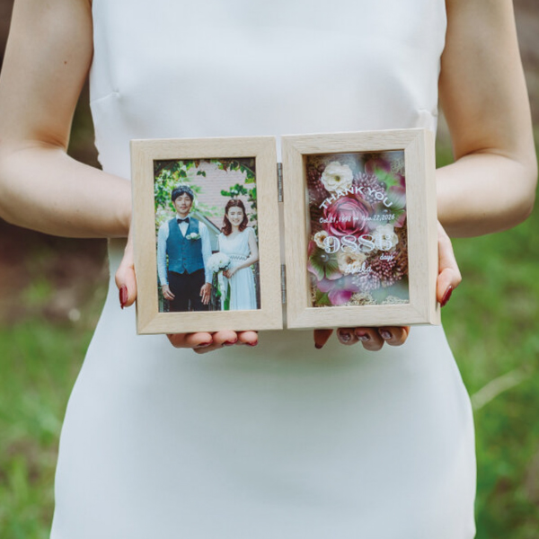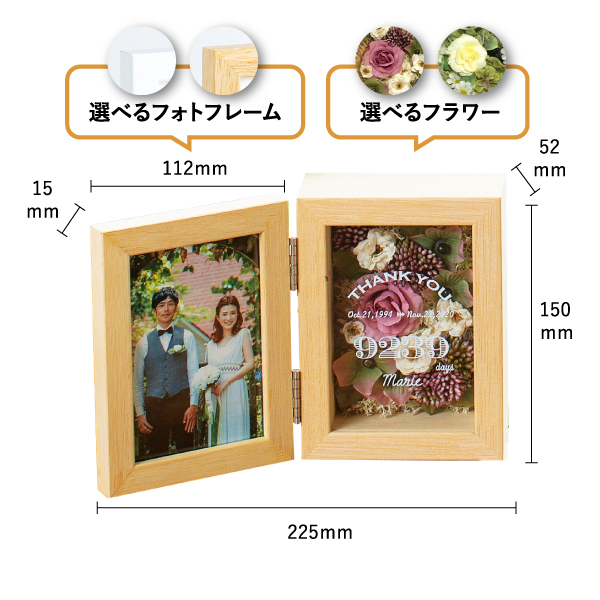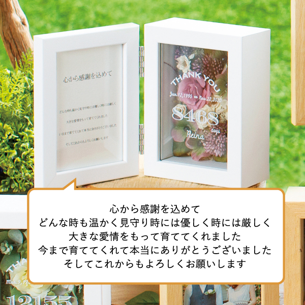 家族との写真をいられるのはもちろんのこと、フラワーが付いている面にも生まれた日から結婚式までの日数と子育て感謝の文面が印字されており、まさに両親へ感謝の気持ちを送るのにぴったりだと思った!