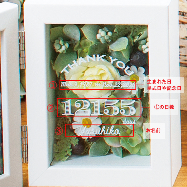 お花を敷き詰めたボックスに、生まれた日から結婚式までの日数を印字した、世界にひとつだけの贈呈品です。