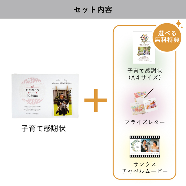 | 無料特典 | ブライズレター1セット(レターケース、専用レター5枚)、子育て感謝状(A4サイズ)(※フレームは付きません。)、サンクスチャペルムービーの中から1つお選びいただけます。 |