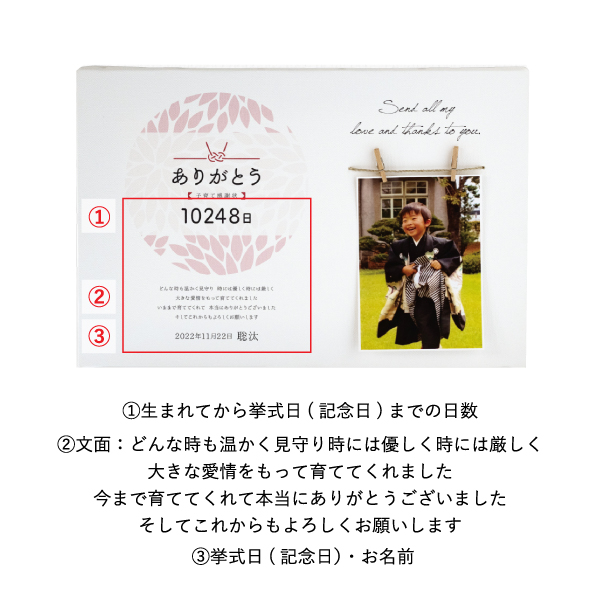 キャンバスに生まれた日から挙式日までの日数を記して、たくさんの感謝の想いを込めた子育て感謝状です。