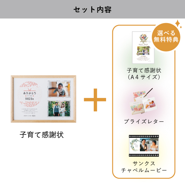| 無料特典 | ブライズレター1セット(レターケース、専用レター5枚)、子育て感謝状(A4サイズ)(※フレームは付きません。)、サンクスチャペルムービーの中から1つお選びいただけます。 |