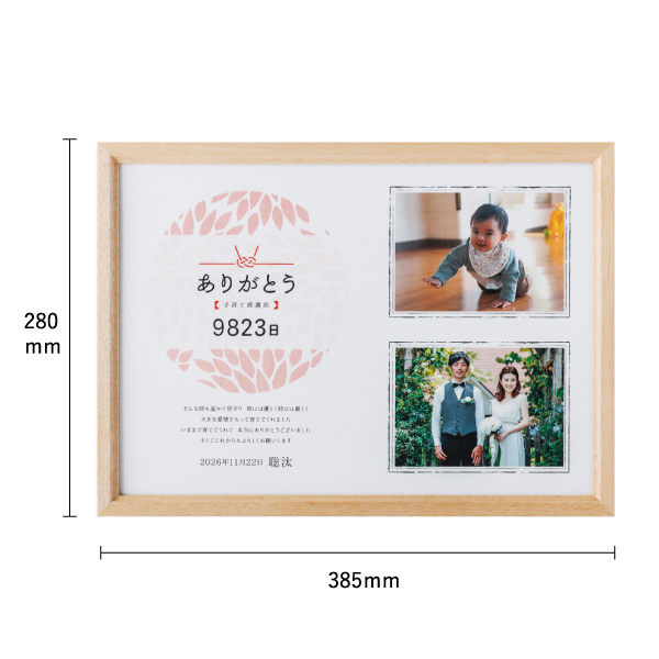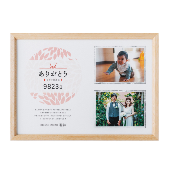 柔らかな印象を感じるナチュラルな木のフレームが、和のデザインが施された子育て感謝状と相性抜群。