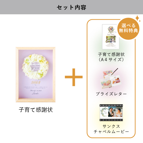 | 無料特典 | ブライズレター1セット(レターケース、専用レター5枚)、子育て感謝状(A4サイズ)(※フレームは付きません。)、サンクスチャペルムービーの中から1つお選びいただけます。 |