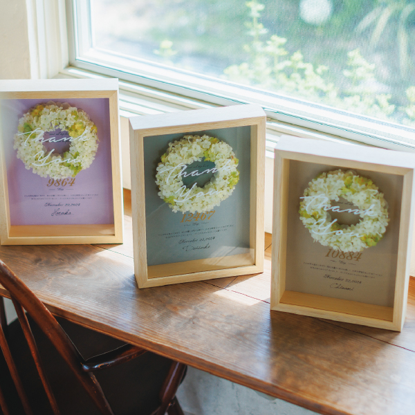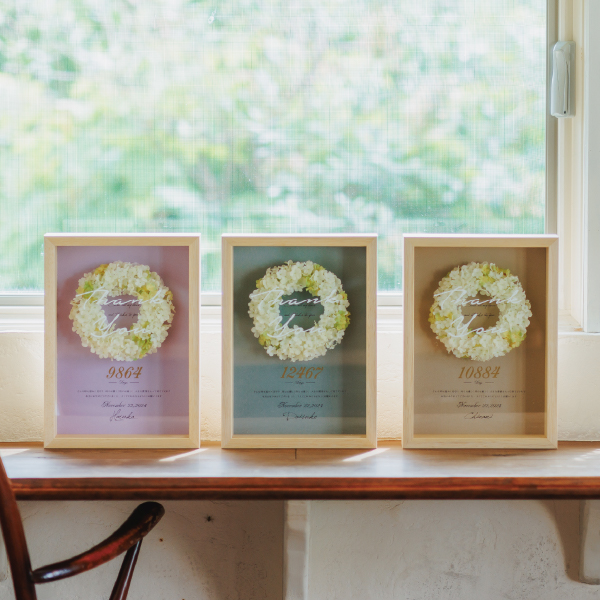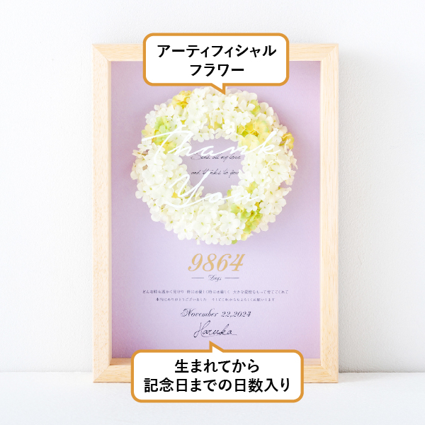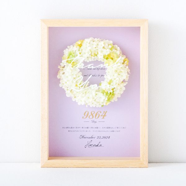 背景に使われたシックな紫が落ち着いた印象を与えます。リースに使われたアーティフィシャルフラワーは、色あせることのない花。これからも続く親子の絆を思わせます。