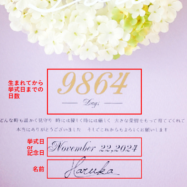ゴールドの数字で記された、生まれたから結婚して巣立つまでの日数が、感謝状のデザインを上品に引き立てています。