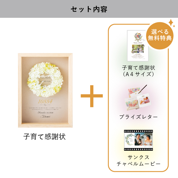 | 無料特典 | ブライズレター1セット(レターケース、専用レター5枚)、子育て感謝状(A4サイズ)(※フレームは付きません。)、サンクスチャペルムービーの中から1つお選びいただけます。 |