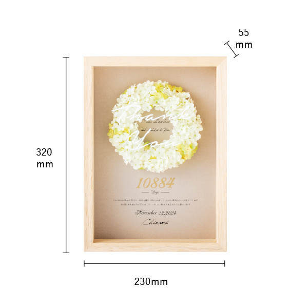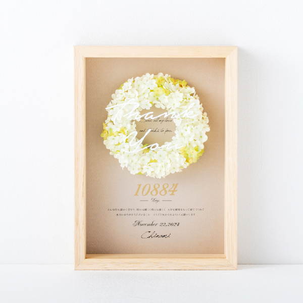 両親贈呈で人気の高い「花」と「子育て感謝状」を一つにした記念品。ホワイトリースにはアーティフィシャルフラワーが使われており、永遠に色あせることのない親子の絆を感じさせます。