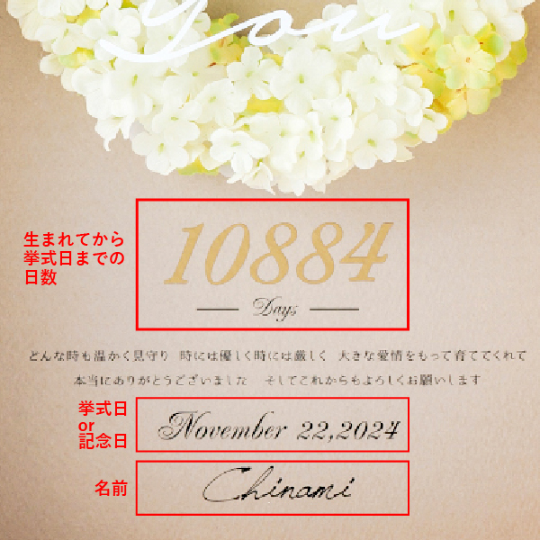生まれてから結婚するまでの、大切な思い出の日々を上品なゴールドの日数にのせて。