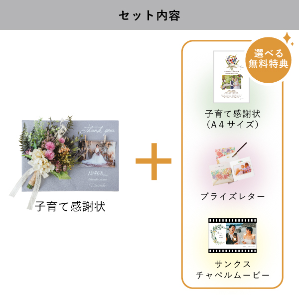 | 無料特典 | ブライズレター1セット(レターケース、専用レター5枚)、子育て感謝状(A4サイズ)(※フレームは付きません。)、サンクスチャペルムービーの中から1つお選びいただけます。 |